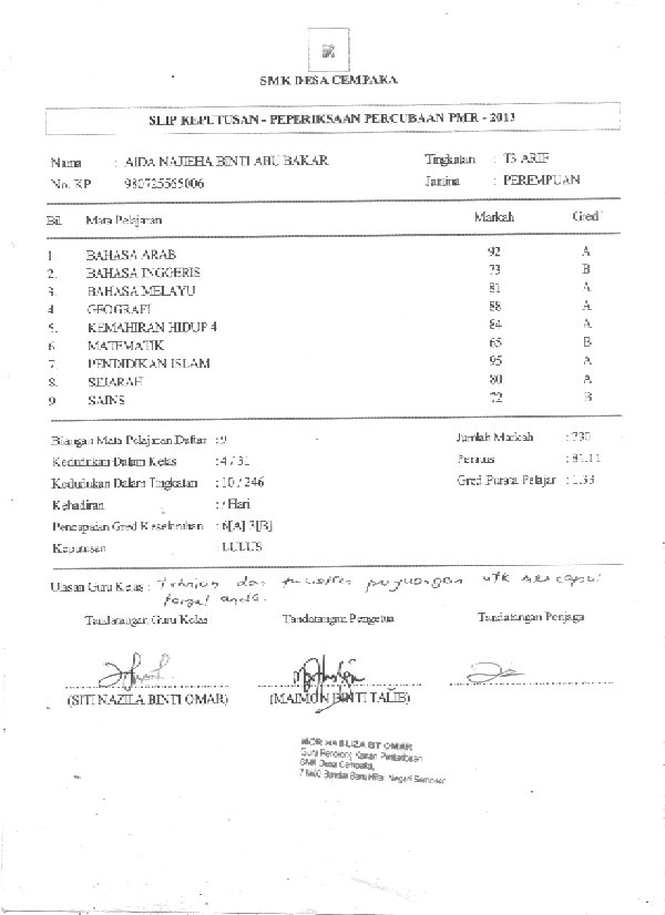 Masuk bulan kedua saya mengamalkannya, saya mula mudah memahami pembelajaran yang diajar, dapat mengingati dan menghuraikan setiap permasalahan dengan jitu dan cepat sehingga membuatkan guru saya berasa terkejut dengan perubahan yang berlaku pada saya. Subjek-subjek yang dahulu sukar sekarang menjadi mudah untuk saya. Saya lebih fokus, mudah dalam mengingat dan menghafal, sekaligus membuatkan saya menjadi anak emas di dalam kelas. Kini, saya berasa lebih cergas dan lebih bersemangat untuk menempuh hari persekolahan. Saya juga berasa gembira kerana dapat menghabiskan semua tajuk dan bersedia untuk menghadapi peperiksaan Sebelum saya mengamalkan Memo Plus Gold, saya hanya meraih 6A 3B sahaja untuk percubaan PMR. Alhamdulillah berkat doa, usaha, dan dorongan Ibu bapa berserta pengambilan Memo Plus Gold yang konsisten, saya memperoleh 9A dalam PMR. Syukur ke hadrat Ilahi, saya kini berada di tingkatan 4 dan berjaya diterima bersekolah di MRSM Parit, Perak. Sehingga kini, saya masih mengamalkan Memo Plus Gold. Di MRSM saya mendapat tempat ketiga dalam pertandingan Kangaroo Mathematics(International)peringkat junior sekolah. Dengan keupayaan Memo Plus Gold yang membantu, saya akan pastikan keputusan yang cemerlang, 9A+ dalam SPM 2015 nanti. Ameen… Moga segalanya dipermudahkan oleh Allah S.W.T.